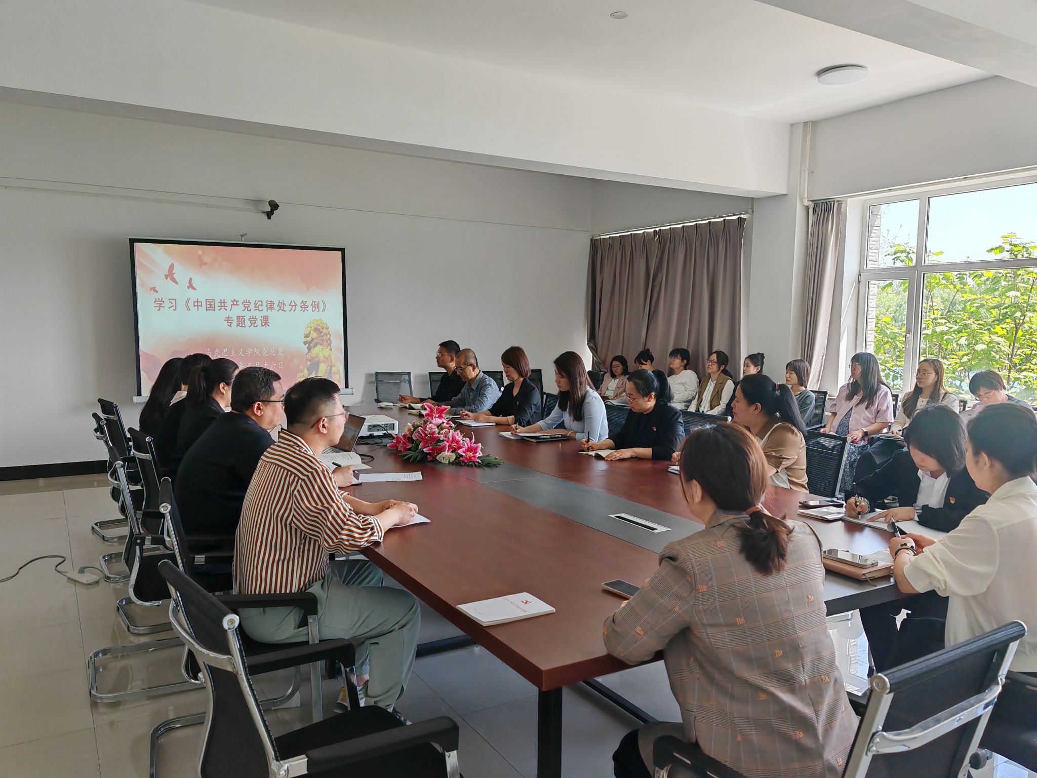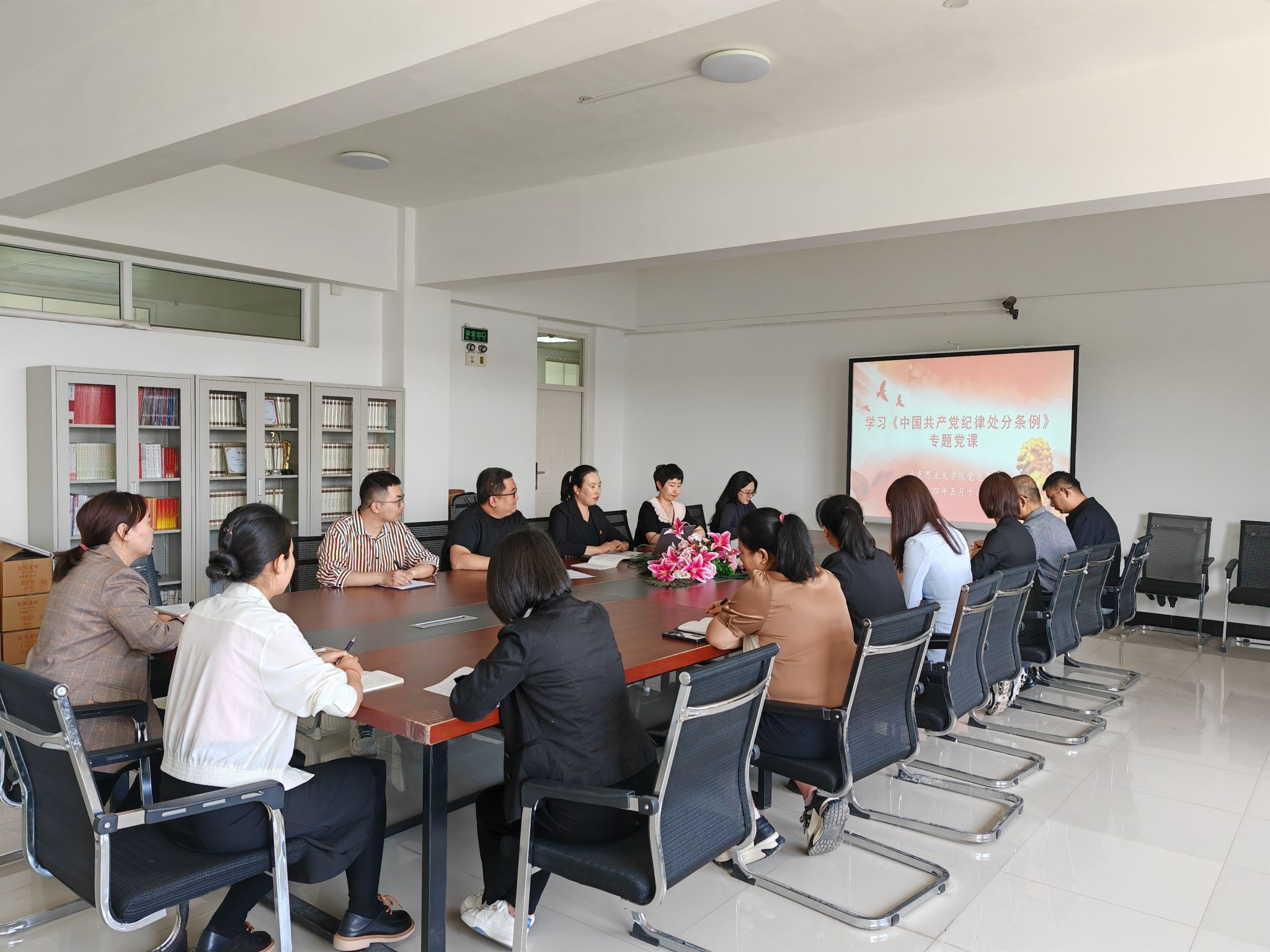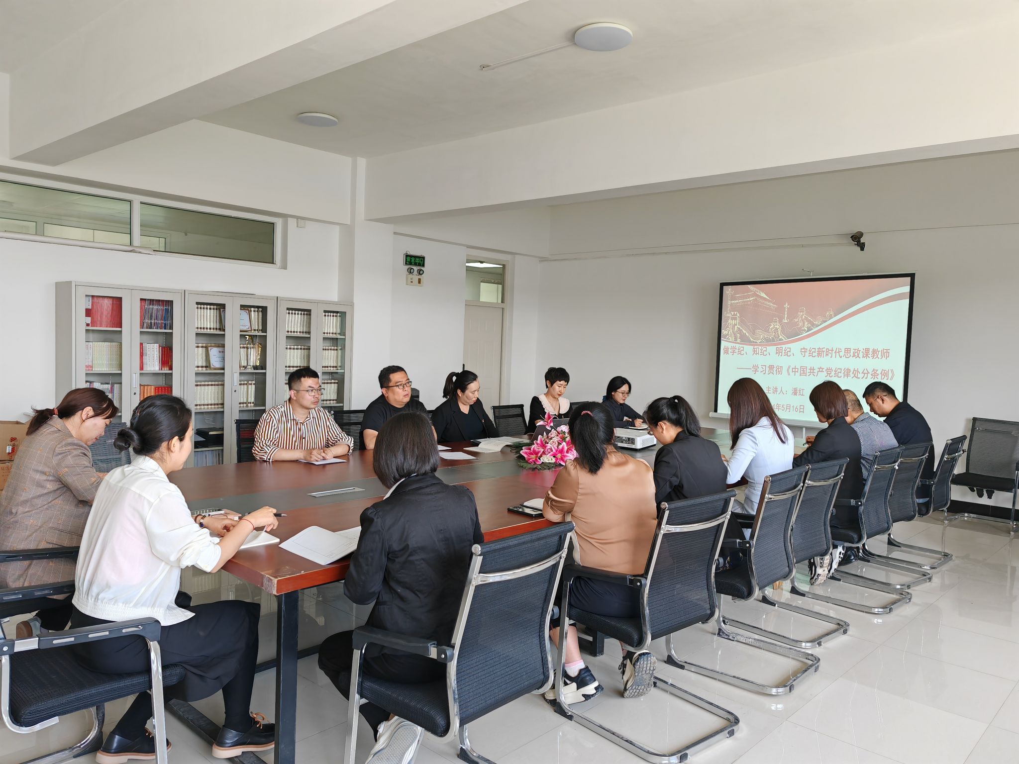 为深入学习贯彻习近平新时代中国特色社会主义思想和党的二十大精神,进一步提升党员教师的党性修养,切实推动党纪学习教育走深走实,认真贯彻落实关于党纪学习教育的部署要求,2024年5月16日下午1点,公司党总支在综合楼308会议室组织党员教师学习了《中国共产党纪律处分条例》,公司党总支书记潘红以《做学纪、知纪、明纪、守纪新时代思政课教师》为题,为全体党员教师讲授了专题党课。