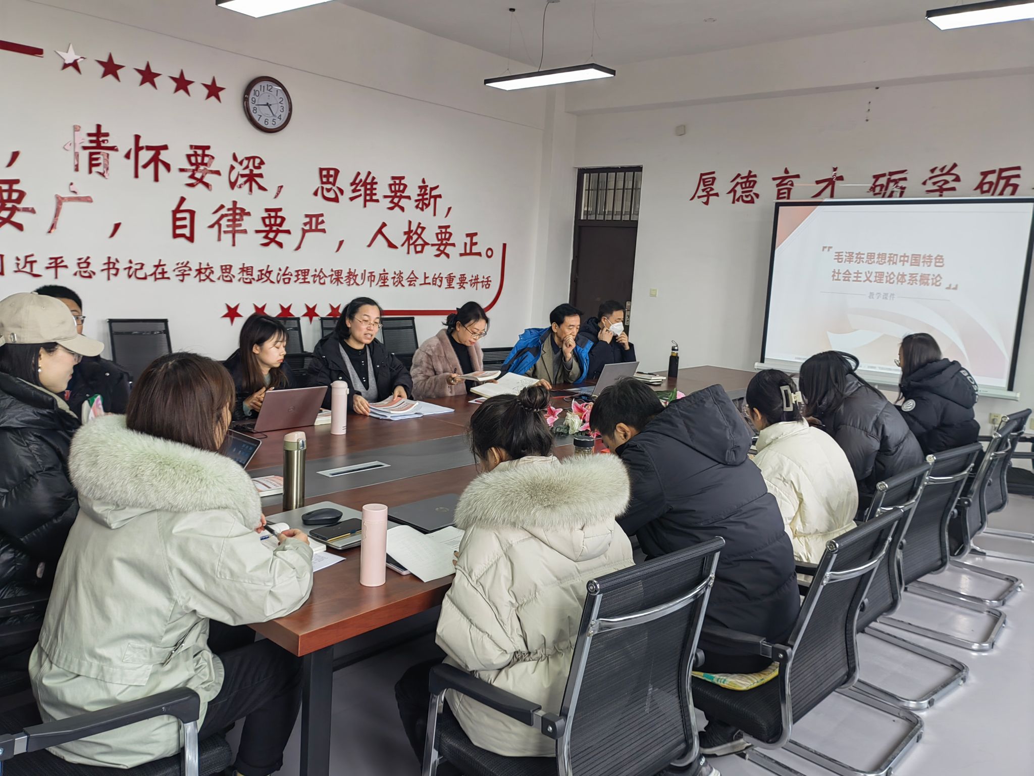 最后,高飞老师对本次集体备课进行总结,并对近期工作进行了安排:一是任课教师要做好上课准备,提前建课,将教材、员工名单、大纲、平时考核记录单及教案提前准备好,认真仔细核对课表,提前15分钟进入教室。二是概论课程组的教师尤其是青年教师要多向老教授请教学习。