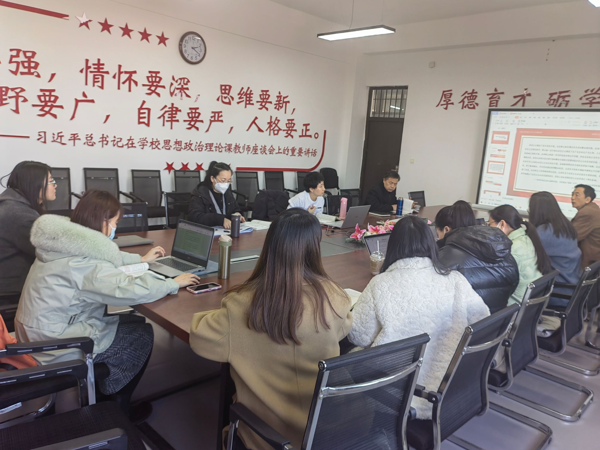 最后,高飞老师对本次集体备课进行总结,并对近期工作进行安排:社会实践方案抓紧时间上交,注意期末题库的上交时间,请各位任课教师抓紧时间检查各章题库。